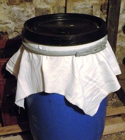 Au bout de quelques jours, fermer les fûts, le contact de l'air (oxygène) avec le moût favorise le développement de micro organismes indésirables. On doit renoncer à une fermentation à l'air libre en utilisant des bondes de fermentation ou alors en plaçant un petit tuyau plastique partant du couvercle du fût (percé au diamètre correspondant) et plongeant dans une bouteille pleine d'eau. Le gaz produit (CO²) doit pouvoir s'échapper des récipients plastiques sinon ils pourraient exploser. Les bulles s'échappant dans la bouteille pleine d'eau signifie que la fermentation est en cours, en fin de fermentation le tuyau est retiré du couvercle et remplacé par un bouchon. En principe on n'ajoute plus rien dès que la fermentation a démarré.